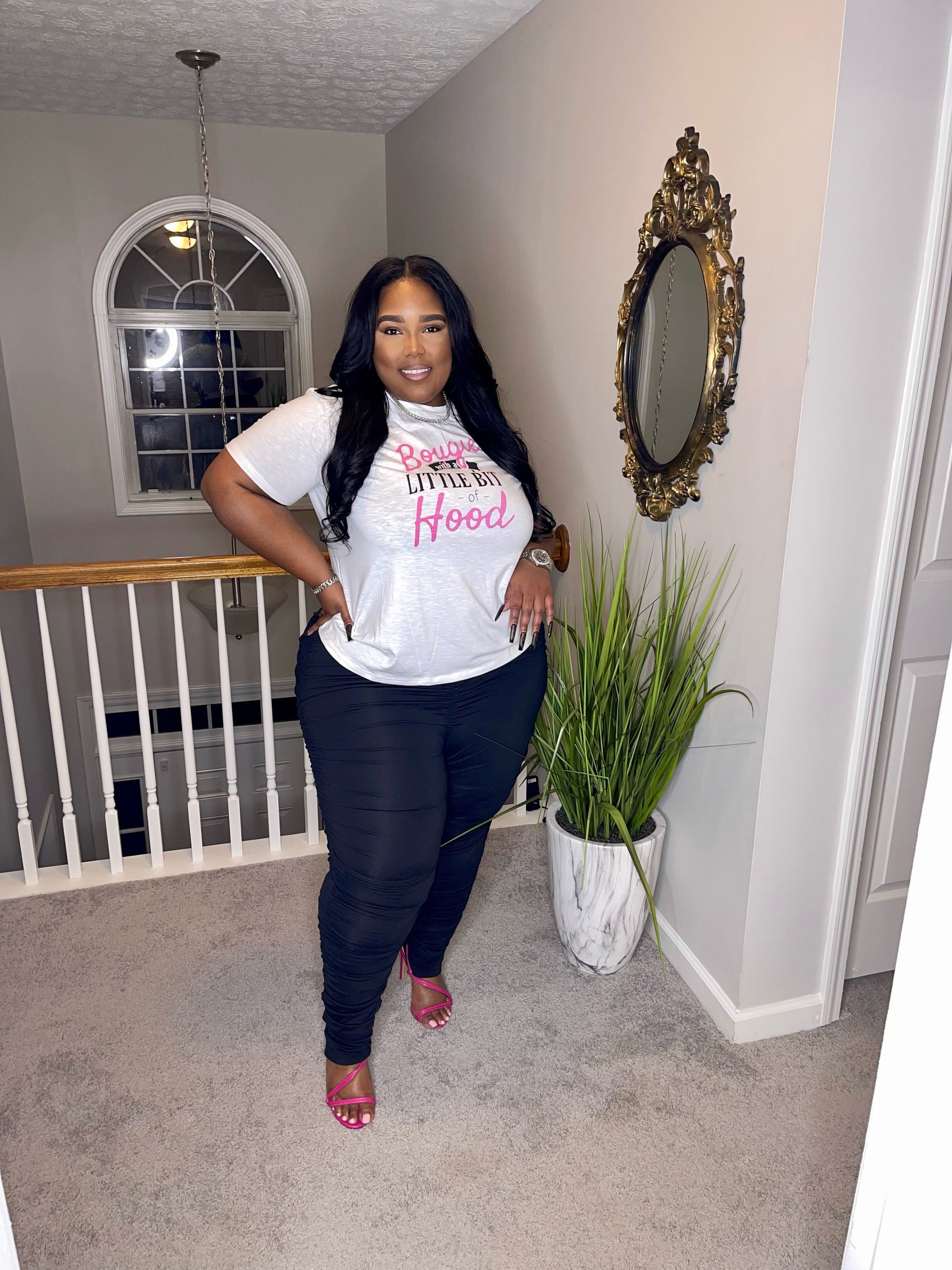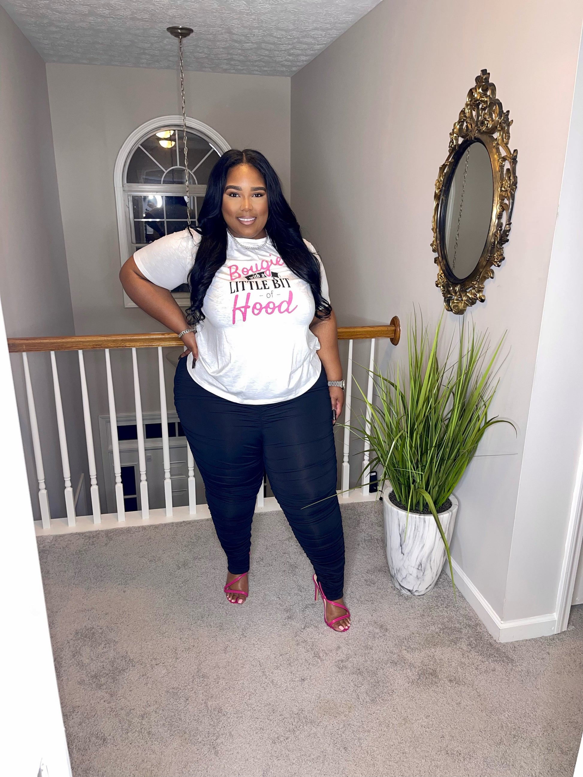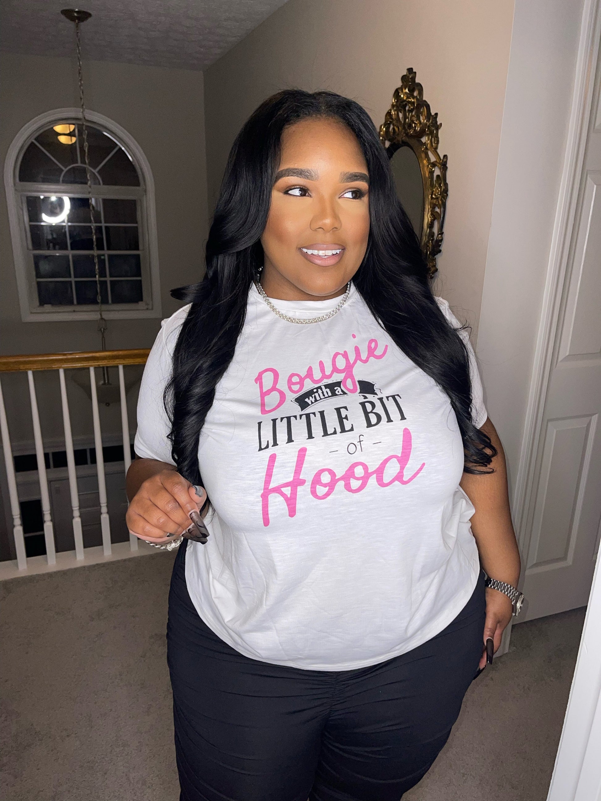 Oversized cotton t shirt with word design “bougie with a little hood”, super comfortable and stretch