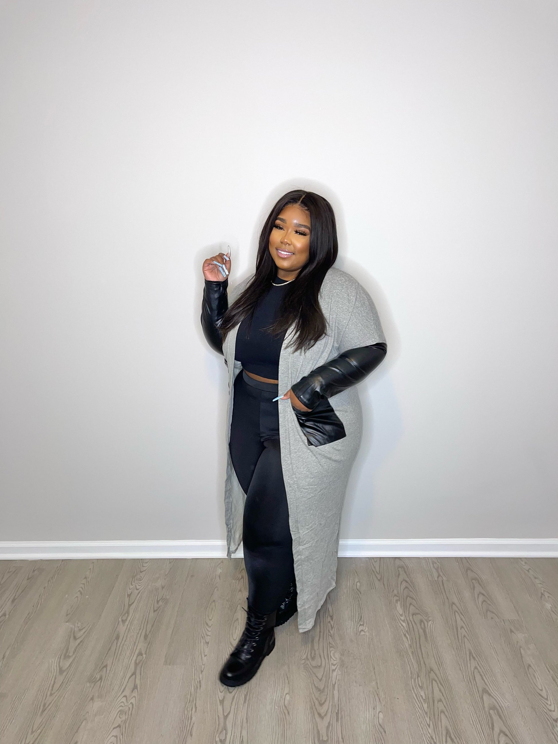 Long sleeve fleece cardigan with faux leather sleeves. The sleeves have some stretch to it so it’s not restricting on the arms. Matching faux leather pockets for a more detail look