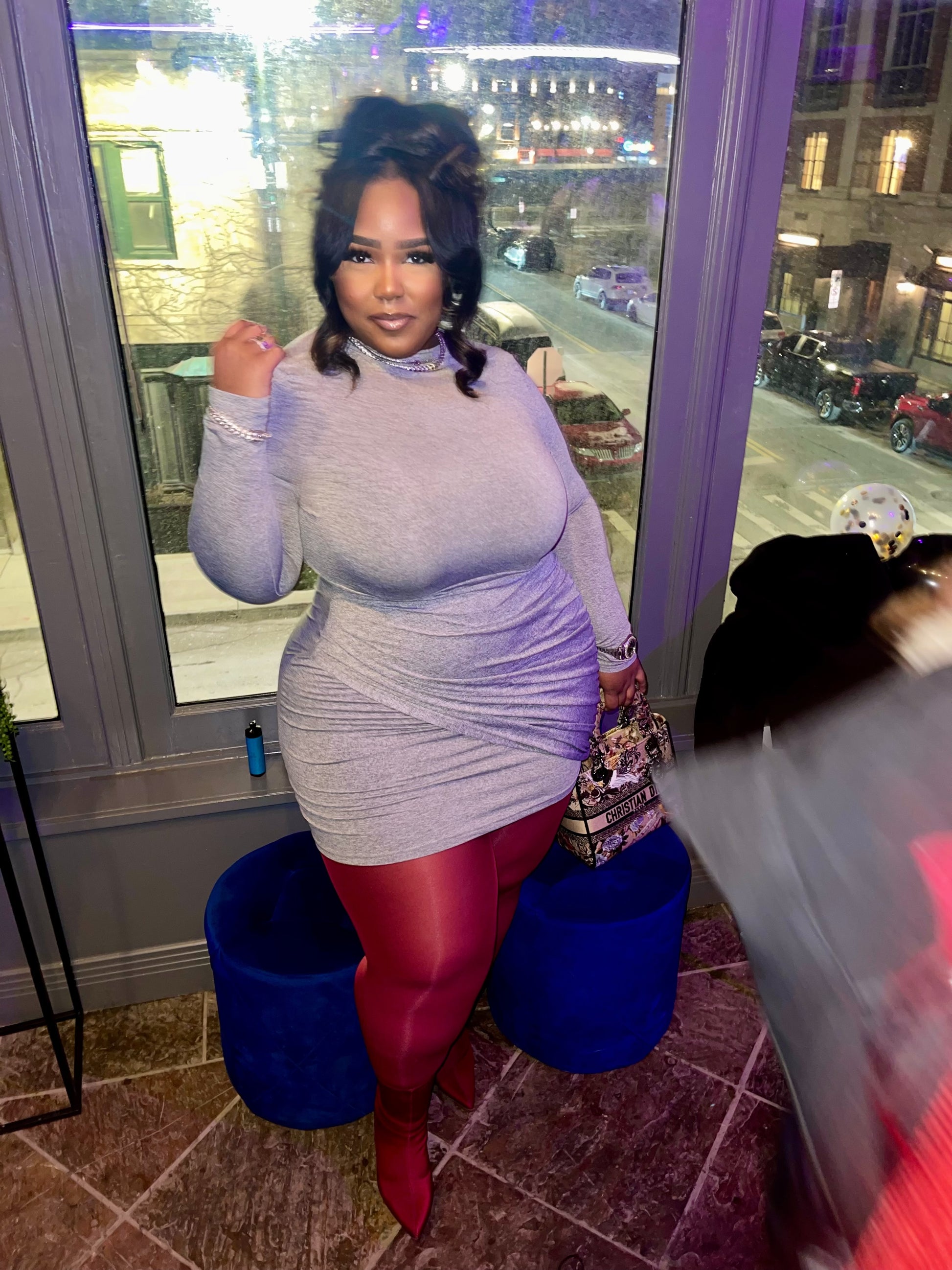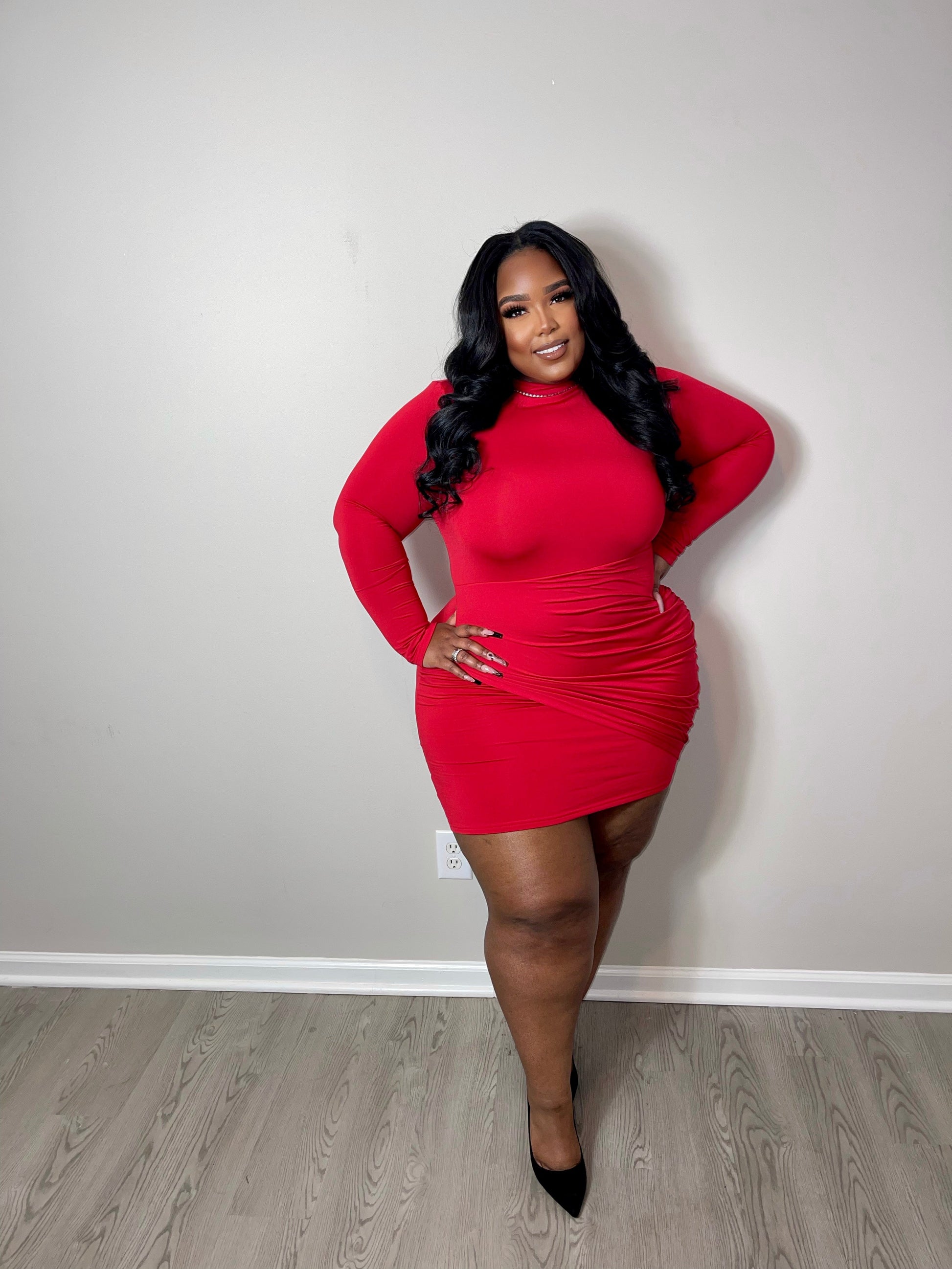 - High turtle neck,long sleeve,hidden zipper in the back,ruched bottom,mini-length skirt