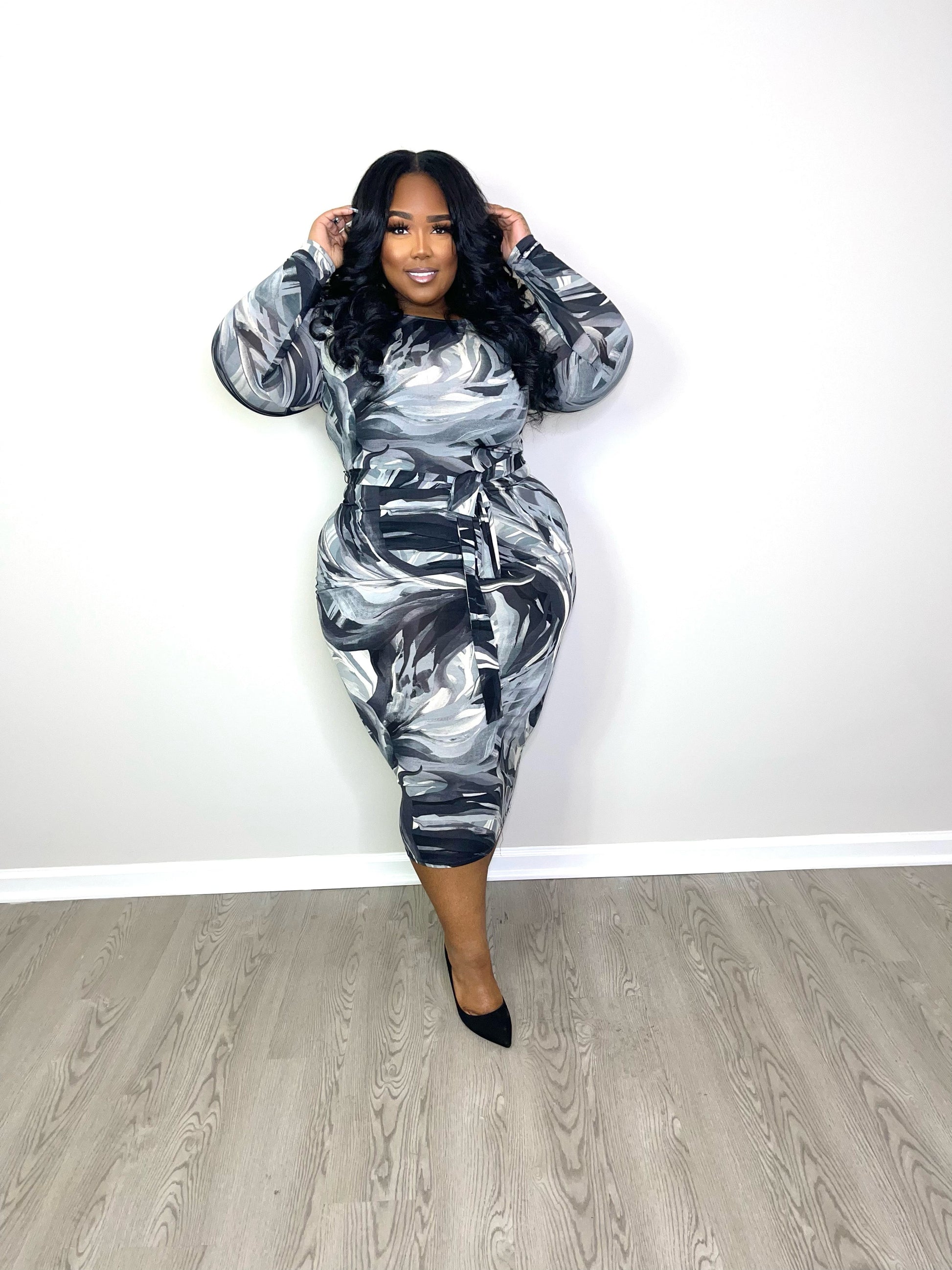 PLUS LONG SLEEVE MIDI DRESS WITH TIE BELT, has stretch to it.